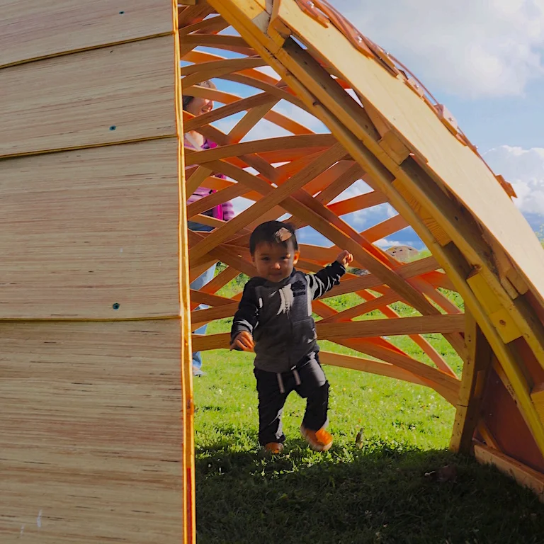 Tactile Interactions is a 6.5’ in Diameter by 6’ high POD constructed with bent wood trusses, plywood and conventional lumber. The pod is divided into six sections with three of those being open and three of them consisting of bent wood trusses that become grass covered lounge seats.