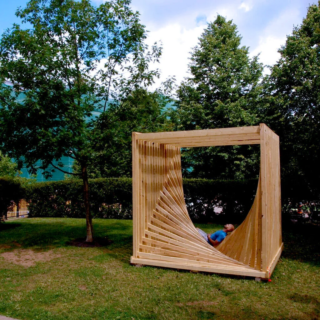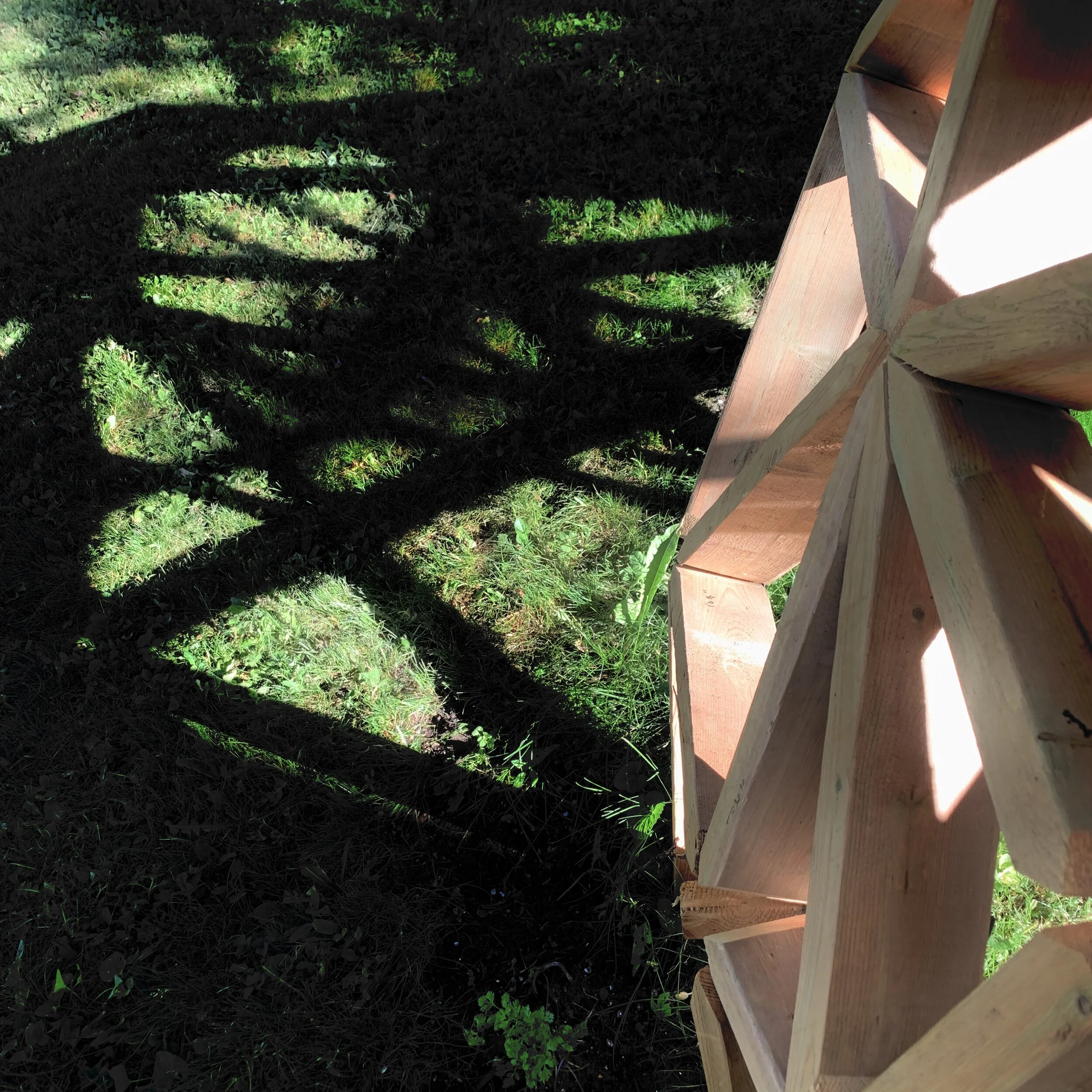 Light/Shadow is a 7’ in Diameter by 5’ high POD constructed with bent wood trusses, plywood and conventional lumber. The POD is tilted to maximize the play of the sun on the structure. The viewer can enter in two sides with the third open side covered with a crisscross of wooden pieces acting as a filter for light. As the time of day and weather changes, the experience of the pods changes. Direct sunlight creates beautiful crisp light/shadow play inside the pod, while angled sunlight causes the crisscrossed wooden elements to glow. Light/Shadow reengages us with the nuances of light in our surroundings.